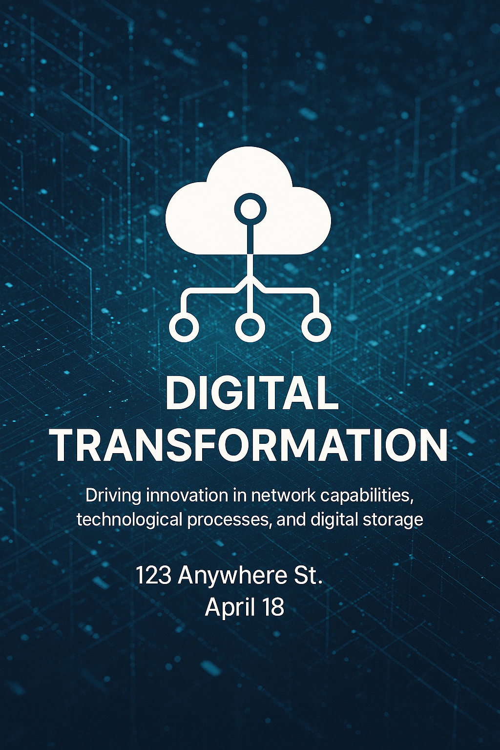/Collection: /by davooda/Type: PNG/Promotional poster for a digital transformation event featuring a sleek design with a tech-themed background, ideal for attracting attendees interested in innovation and technology.