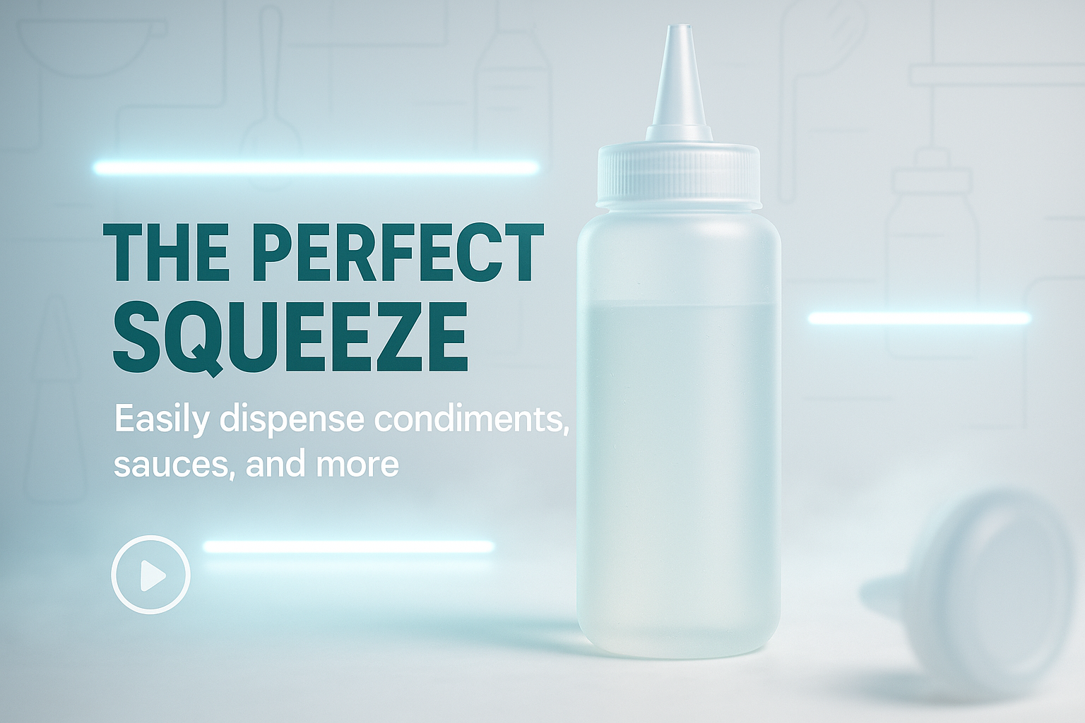 Promotional image showcasing a squeeze bottle designed for dispensing condiments and sauces, featuring a clean, minimalistic style with soft lighting and a modern aesthetic, ideal for kitchenware marketing.