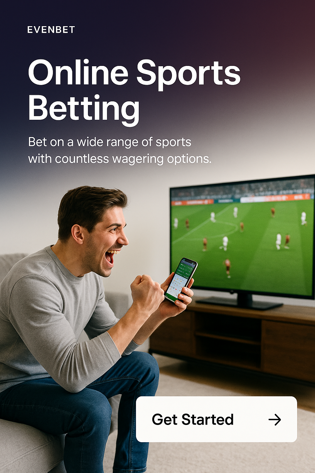 A vibrant web page design showcasing online sports betting. Features a man excitedly using a mobile app while watching a game on TV. Eye-catching action button included.