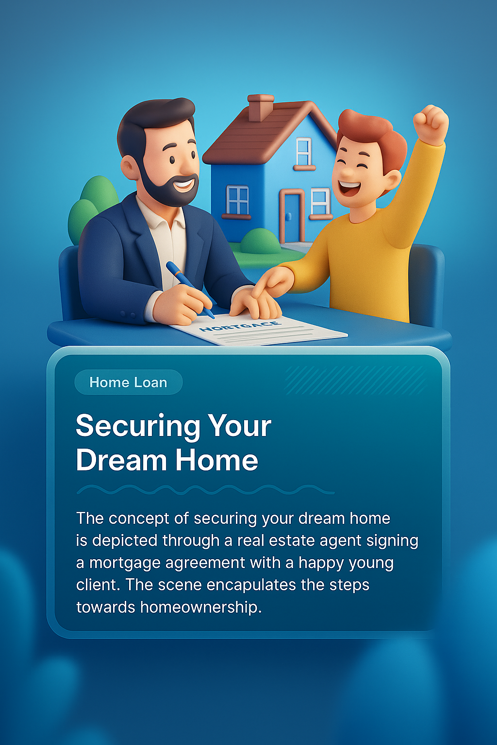 /Collection: /by davooda/Type: PNG/A vibrant 3D illustration showcasing a realtor signing a mortgage agreement with a joyful young client. The background features a house and a gradient that enhances the scene's depth.