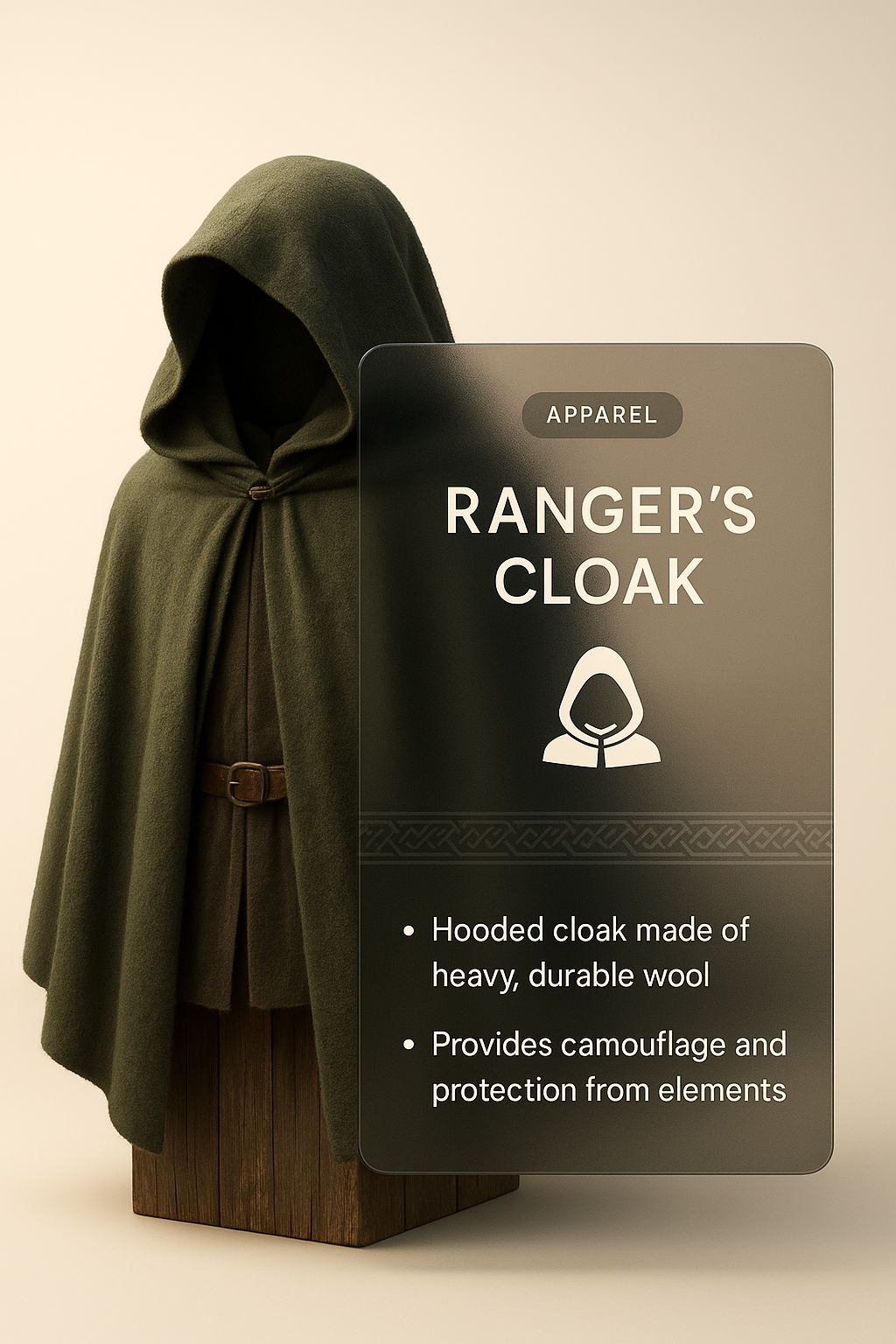 A 3D illustration of a ranger's cloak made from durable wool, featuring a hood. An integrated overlay provides essential details about the cloak, enhancing its visual appeal.