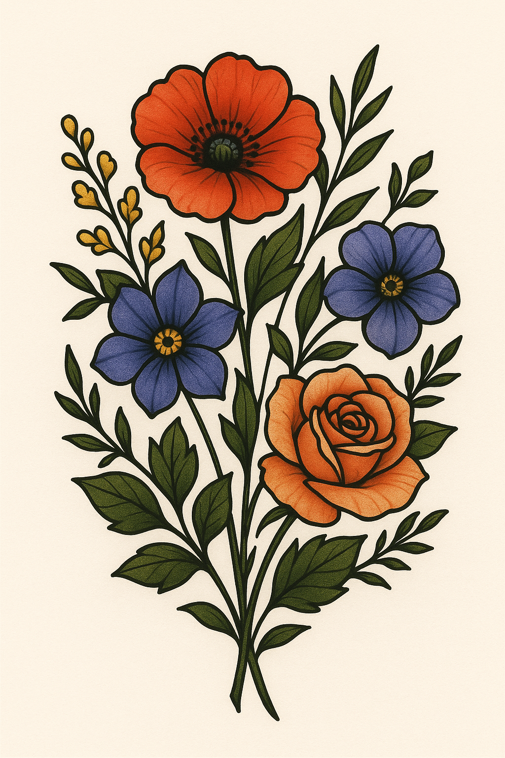A beautifully detailed botanical illustration featuring a variety of colorful flowers including poppies, violets, and roses, ideal for decor or print design.