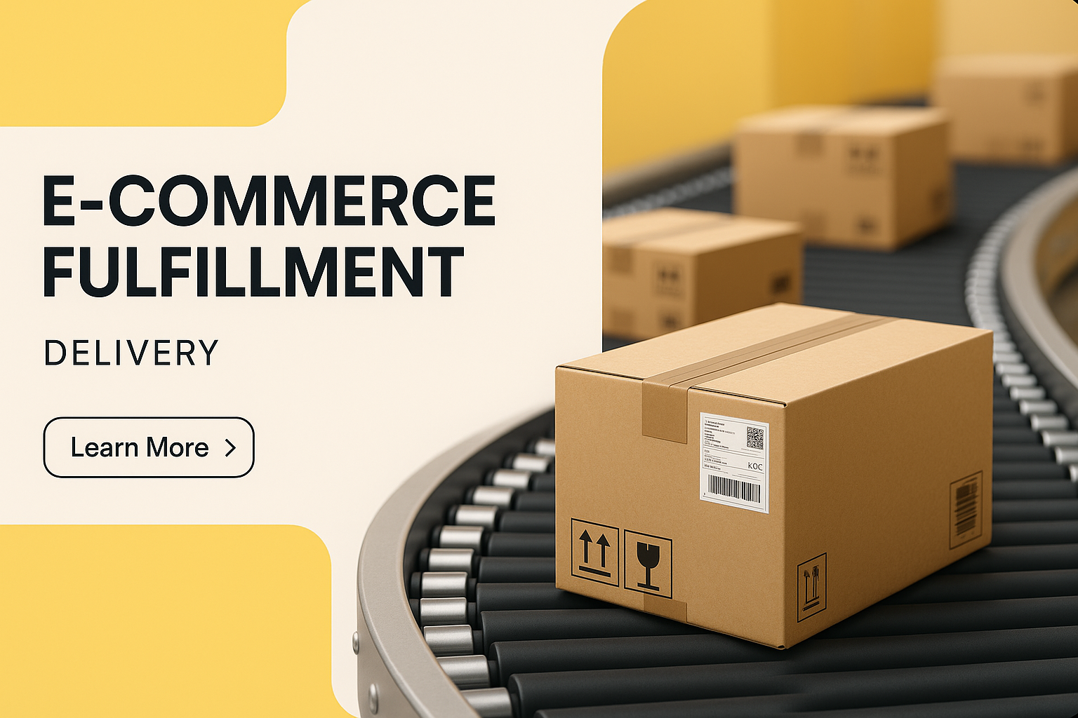 /Collection: /by davooda/Type: PNG/Closeup of cardboard boxes on a conveyor belt in a bright, modern fulfillment center. The layout features bold typography and a clear call-to-action, emphasizing delivery automation.