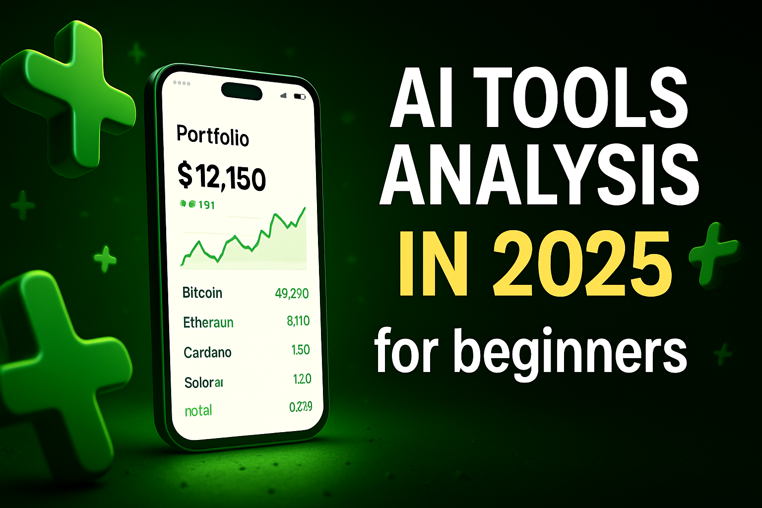 /Collection: /by Sergey Leonov/Type: PNG/Modern graphic showcasing a smartphone displaying a financial portfolio analysis, designed for beginners interested in AI tools for 2025. The vibrant green background emphasizes growth and technology.
