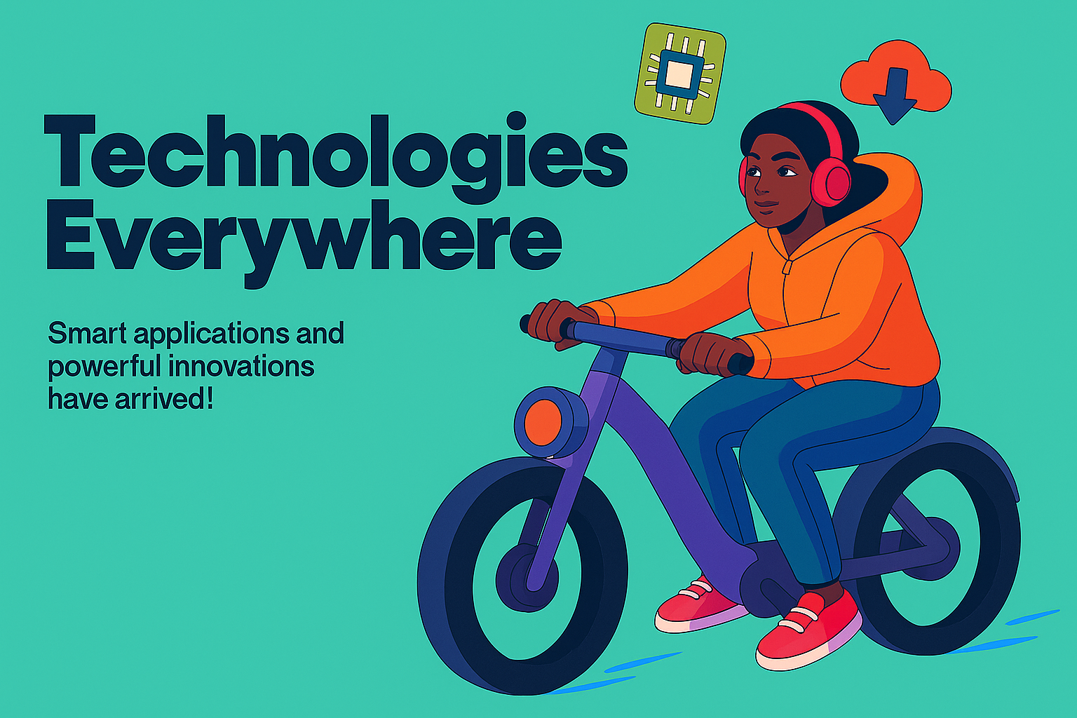 /Collection: /by davooda/Type: PNG/A vibrant vector illustration featuring a person on a bicycle wearing headphones, set against a bright turquoise background. The artwork emphasizes technology with bold typography.