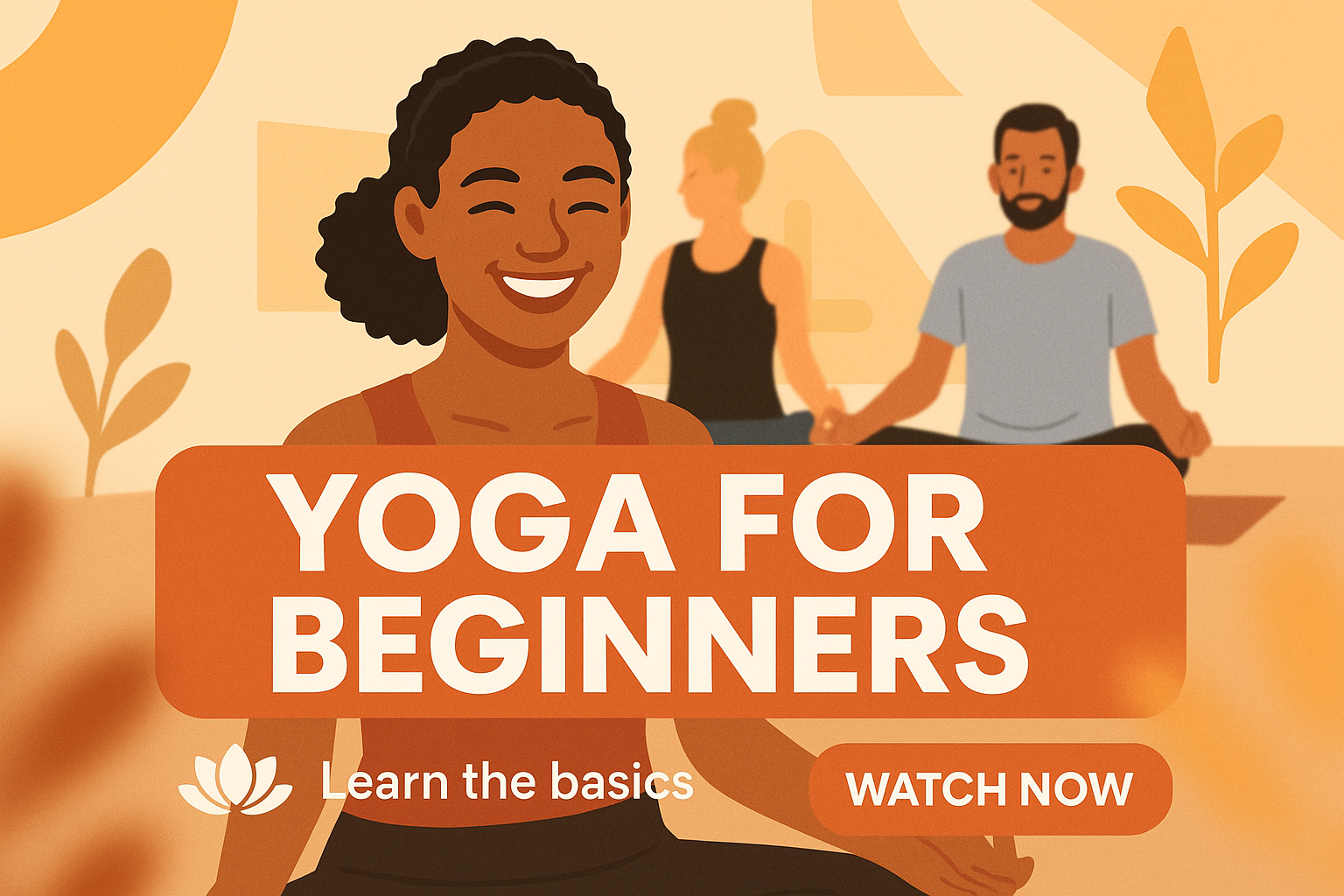 Vibrant promotional image for a yoga class targeting beginners, featuring cheerful characters in a calming setting. Ideal for online classes or social media.
