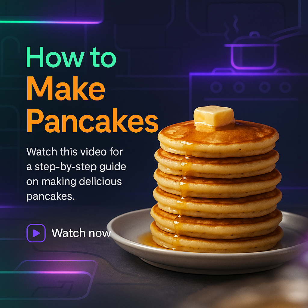 Vibrant video thumbnail showcasing a stack of pancakes with syrup and butter, designed to attract viewers to a cooking tutorial. Ideal for social media or video platforms.