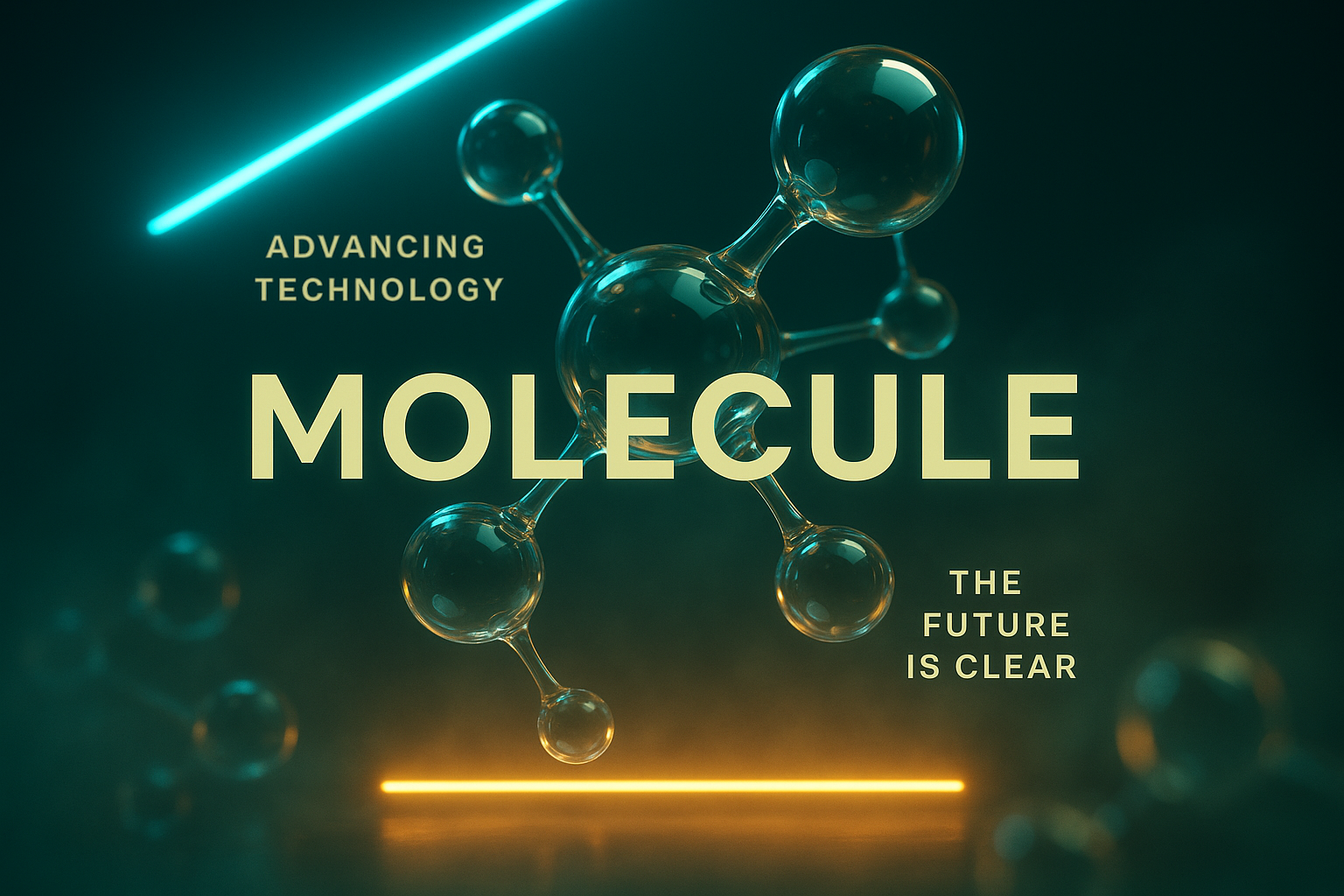 A visually striking representation of a molecule featuring neon lights and a translucent glass effect. The composition includes layered text elements emphasizing technology and clarity.