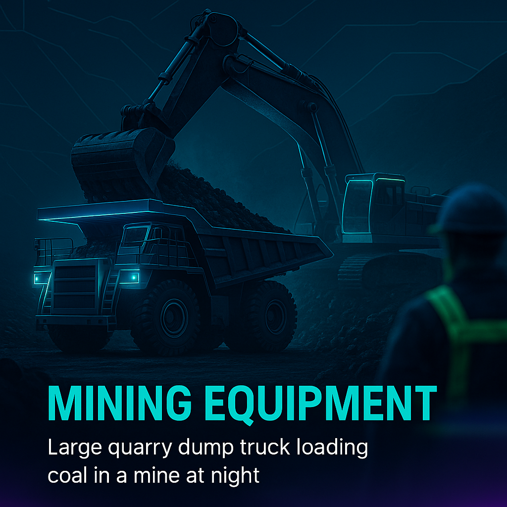 /Collection: /by davooda/Type: PNG/Digital illustration depicting heavy mining machinery at night, showcasing a dump truck loading coal in a quarry. The dark atmosphere emphasizes the industrial theme, suitable for mining industry visuals.