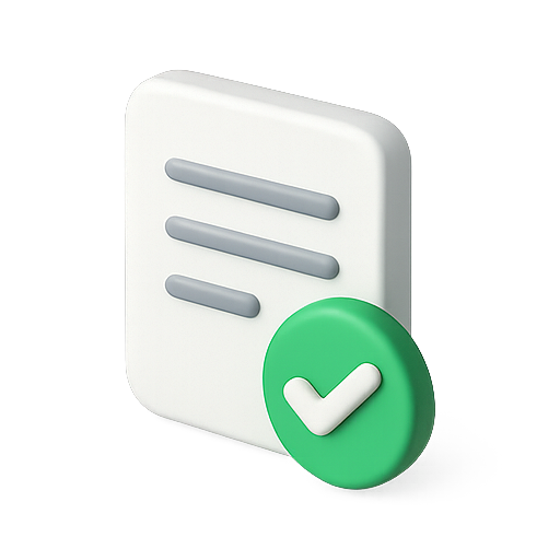 Stylized 3D icon representing a document with a green checkmark, ideal for use in digital applications, project management tools, or confirming tasks.