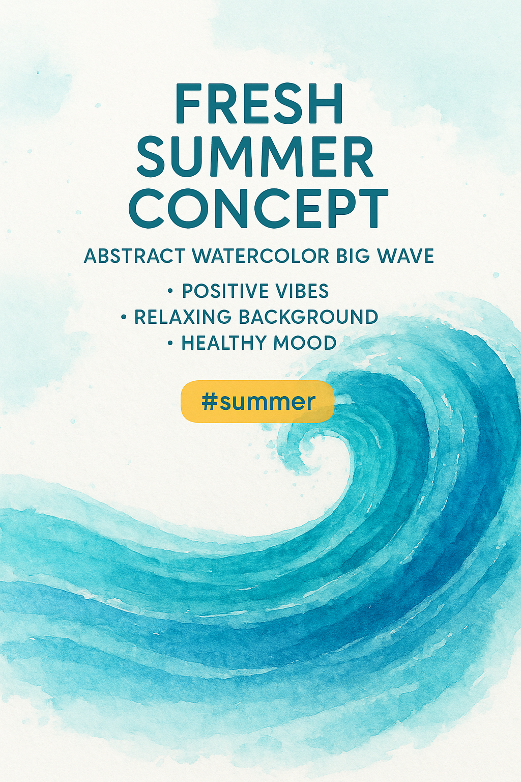 A vibrant abstract watercolor depiction of a big wave, conveying a fresh and positive summer vibe. Ideal for wellness or seasonal promotional content.