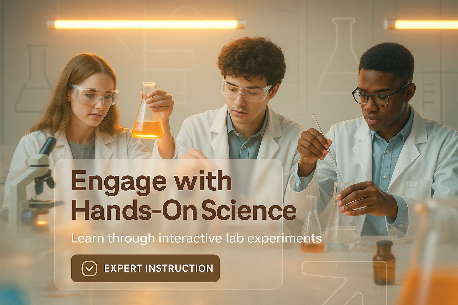 A dynamic educational graphic showcasing students engaged in hands-on science experiments in a lab setting, ideal for promoting interactive learning.