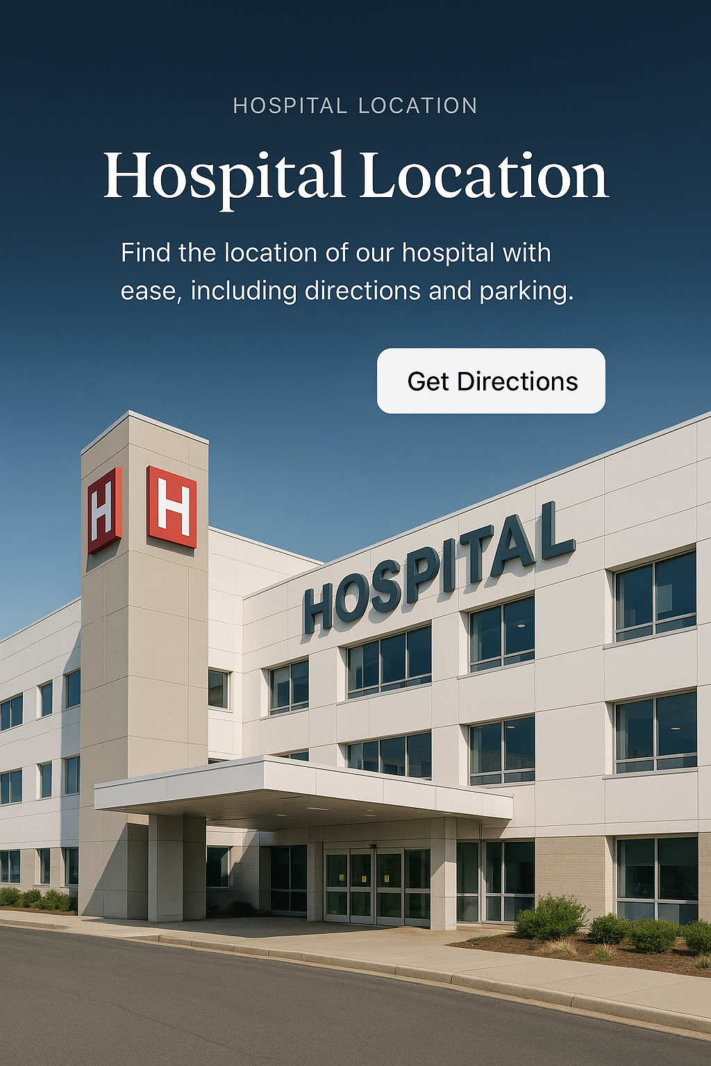 A modern hospital building with a clear sign, featuring a 'Get Directions' button. The design includes a gradient background and emphasizes readability.