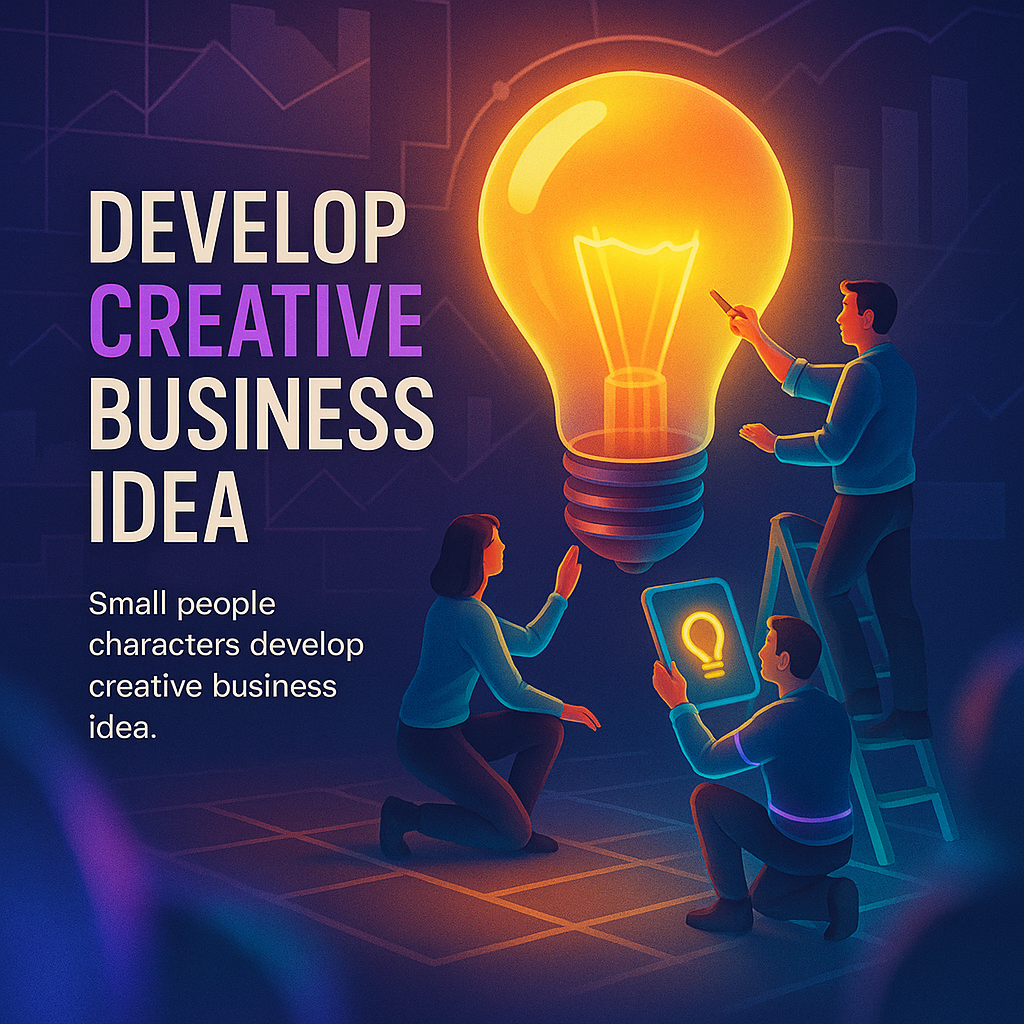 /Collection: /by davooda/Type: PNG/Vibrant illustration depicting small characters brainstorming a creative business idea, featuring a large glowing light bulb. Ideal for entrepreneurial content and presentations.