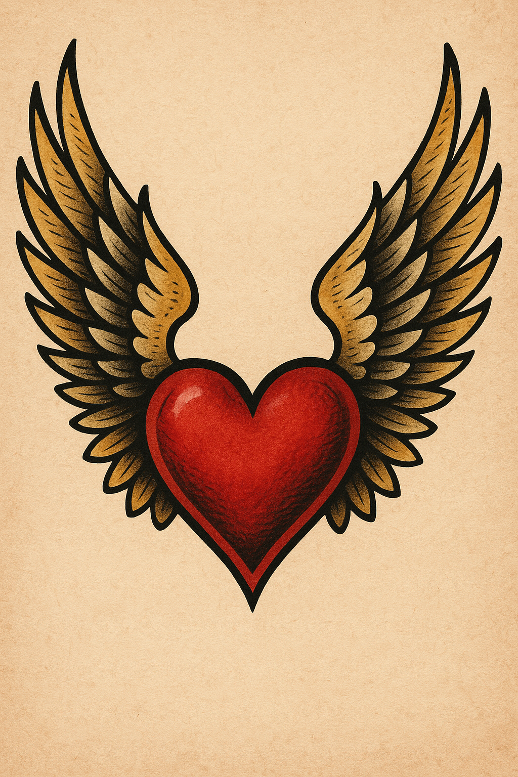 /Collection: /by davooda/Type: PNG/This is a vintage-style illustration featuring a red heart with angelic wings. It combines bold colors and defined lines, making it suitable for tattoos, greeting cards, or romantic themes.
