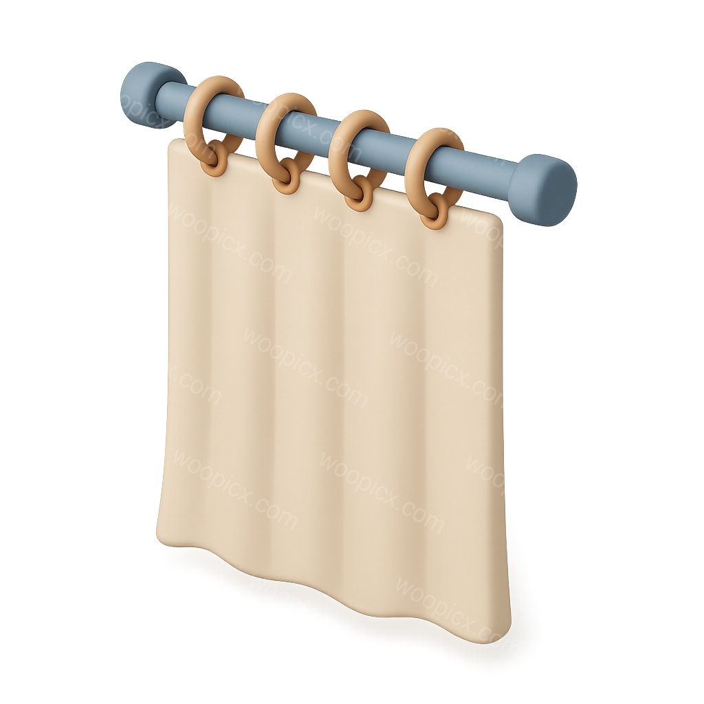A visually appealing 3D icon of a shower curtain featuring rings. The curtain is shown in a three-quarter view with a soft color palette and a translucent background, enhancing its volumetric feel.