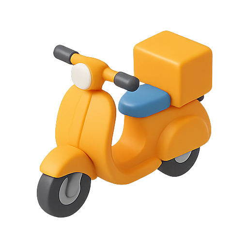 A vibrant and playful 3D illustration of a scooter, featuring a bright orange body and a delivery box, ideal for delivery service branding or transportation themes.