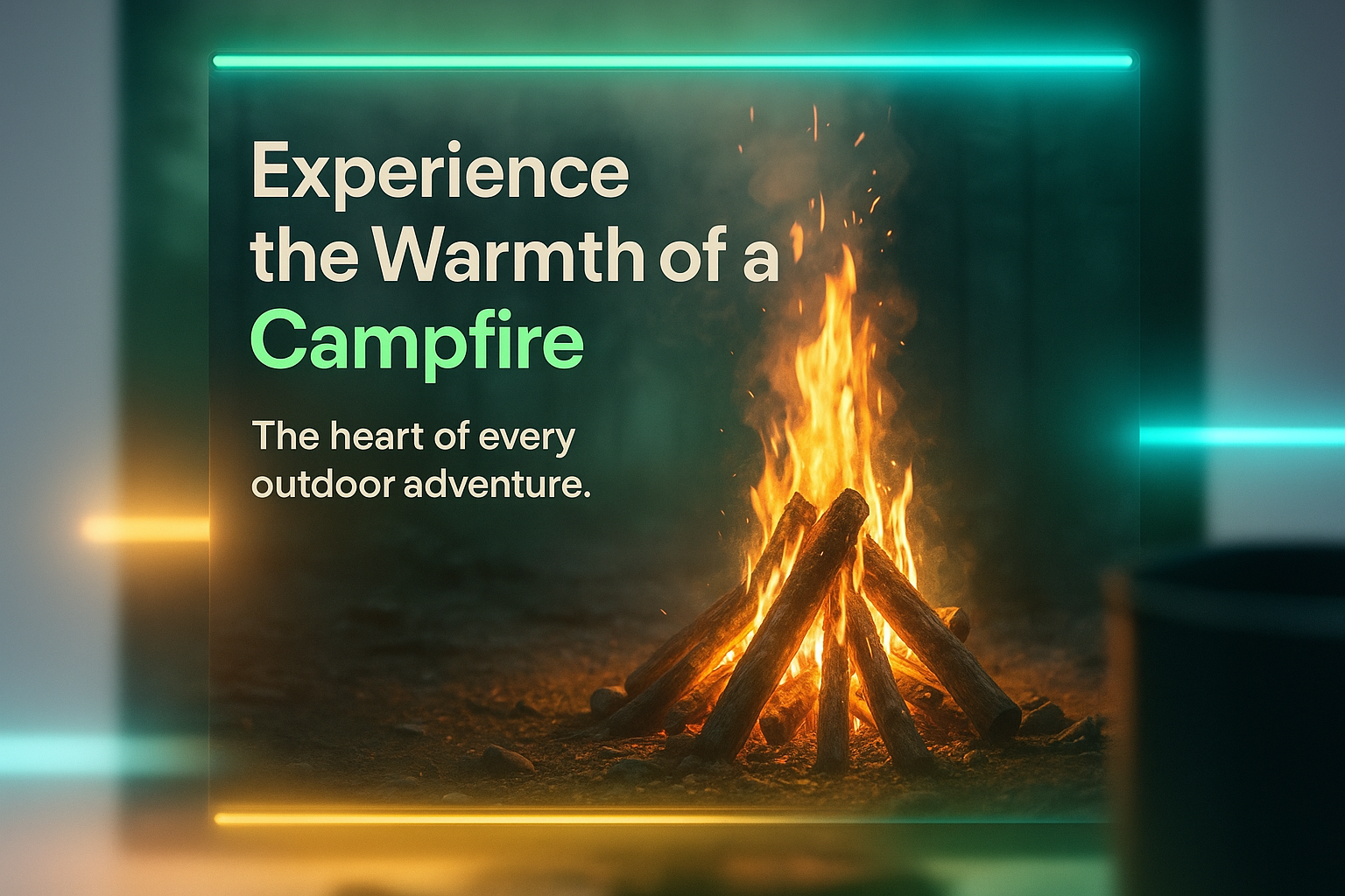 /Collection: /by davooda/Type: PNG/A realistic depiction of a glowing campfire surrounded by a misty atmosphere, with engaging text inviting viewers to experience outdoor adventures. Neon accents enhance the visual appeal.