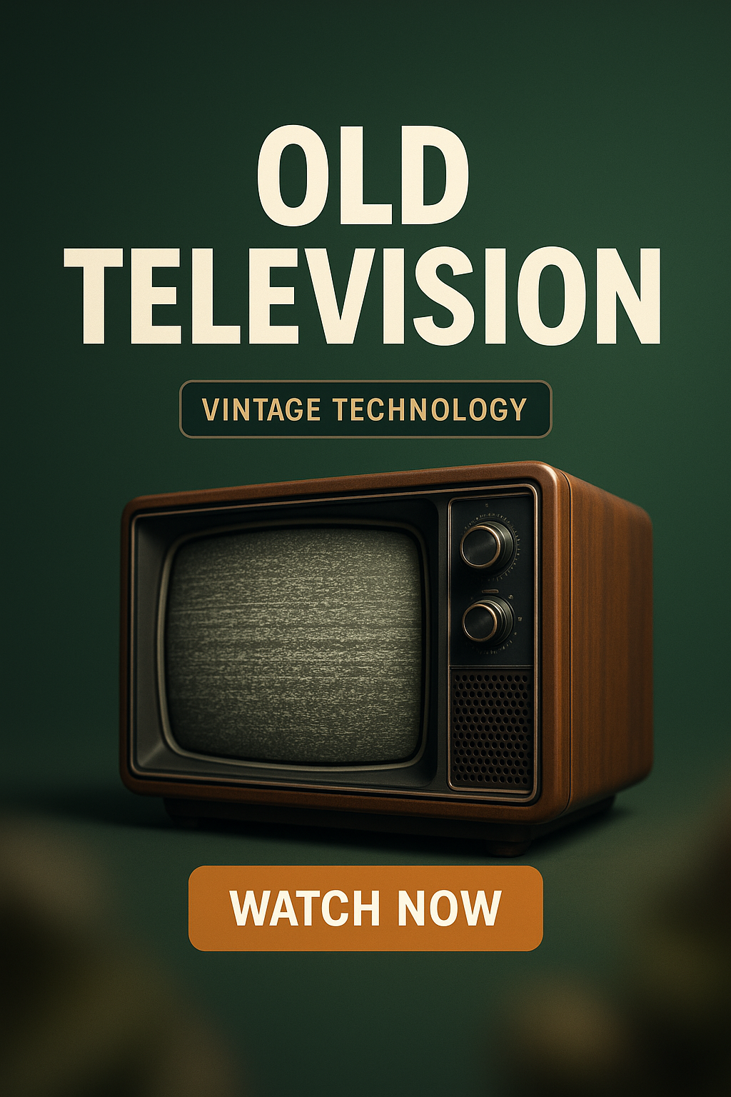 A visually appealing graphic showcasing a vintage television set with a dark green background, emphasizing nostalgia and inviting viewers to engage with a 'Watch Now' call to action.