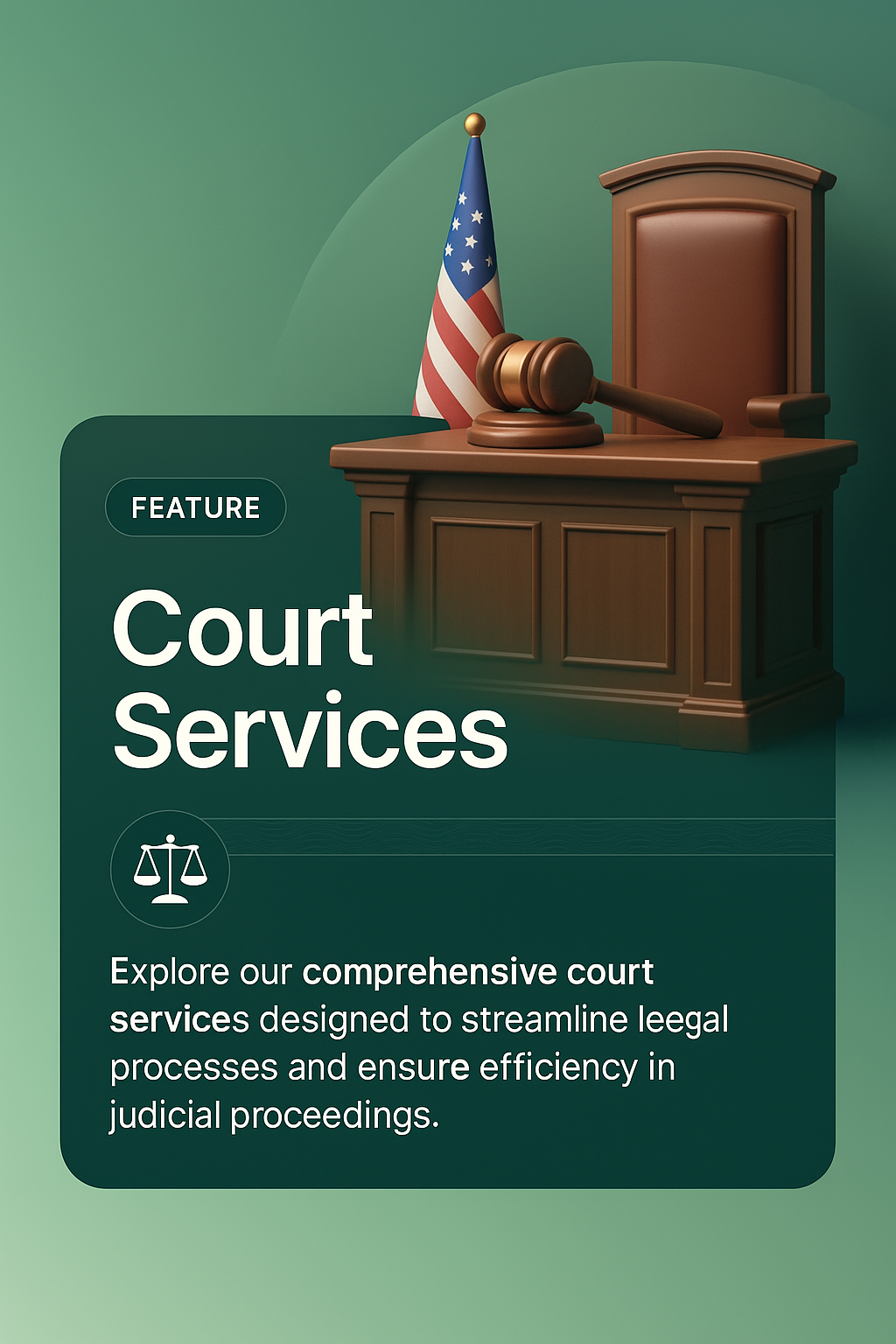 /Collection: /by davooda/Type: PNG/A visually engaging advertisement template featuring an empty courtroom scene. It includes a central 3D illustration of a judge's bench with a gavel and flag, set against a gradient background. The design has designated text areas for features and descriptions.