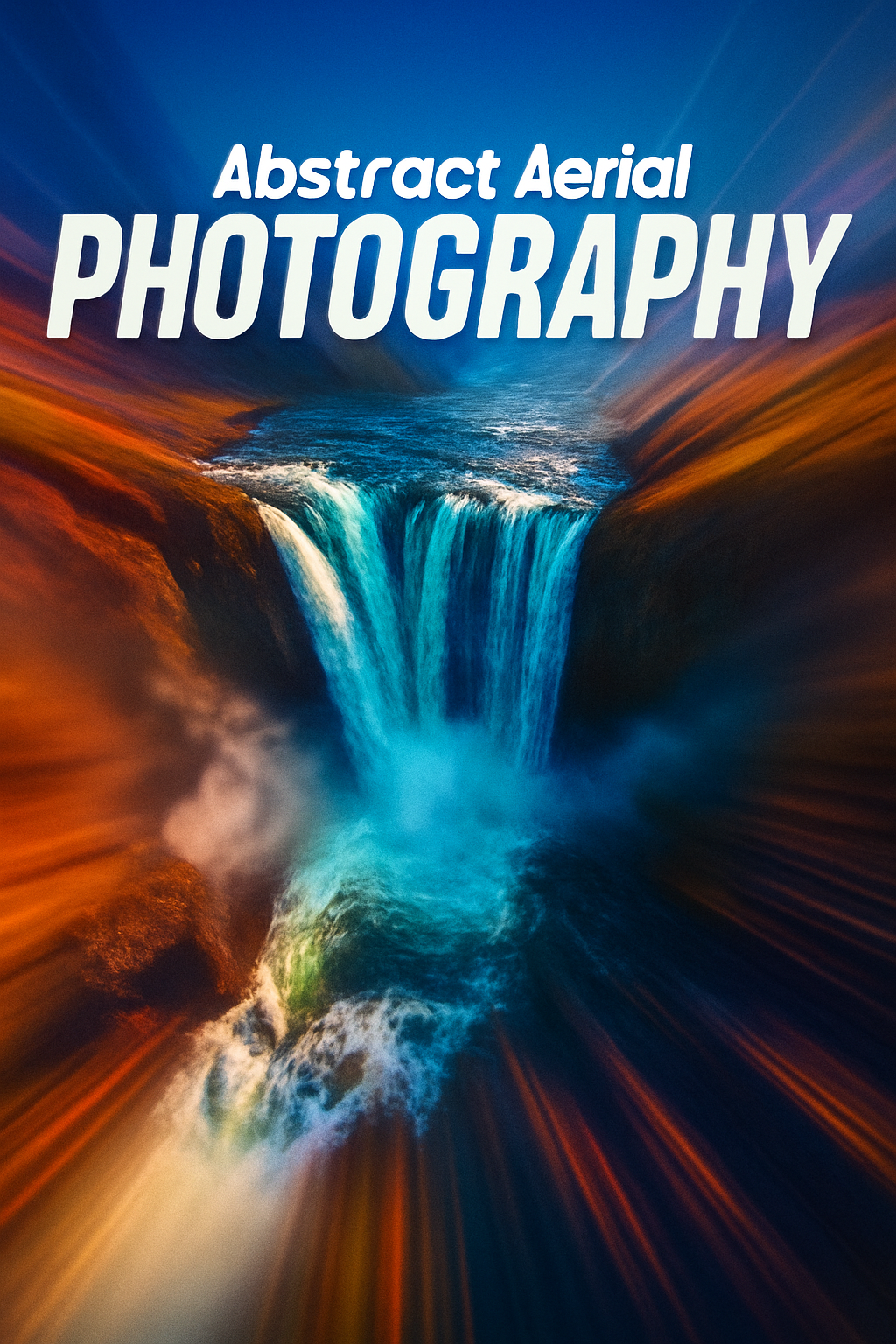 An abstract aerial photograph showcasing a vibrant cascading waterfall with misty waters. The dynamic perspective offers a surreal view, enhanced by a rich color palette.