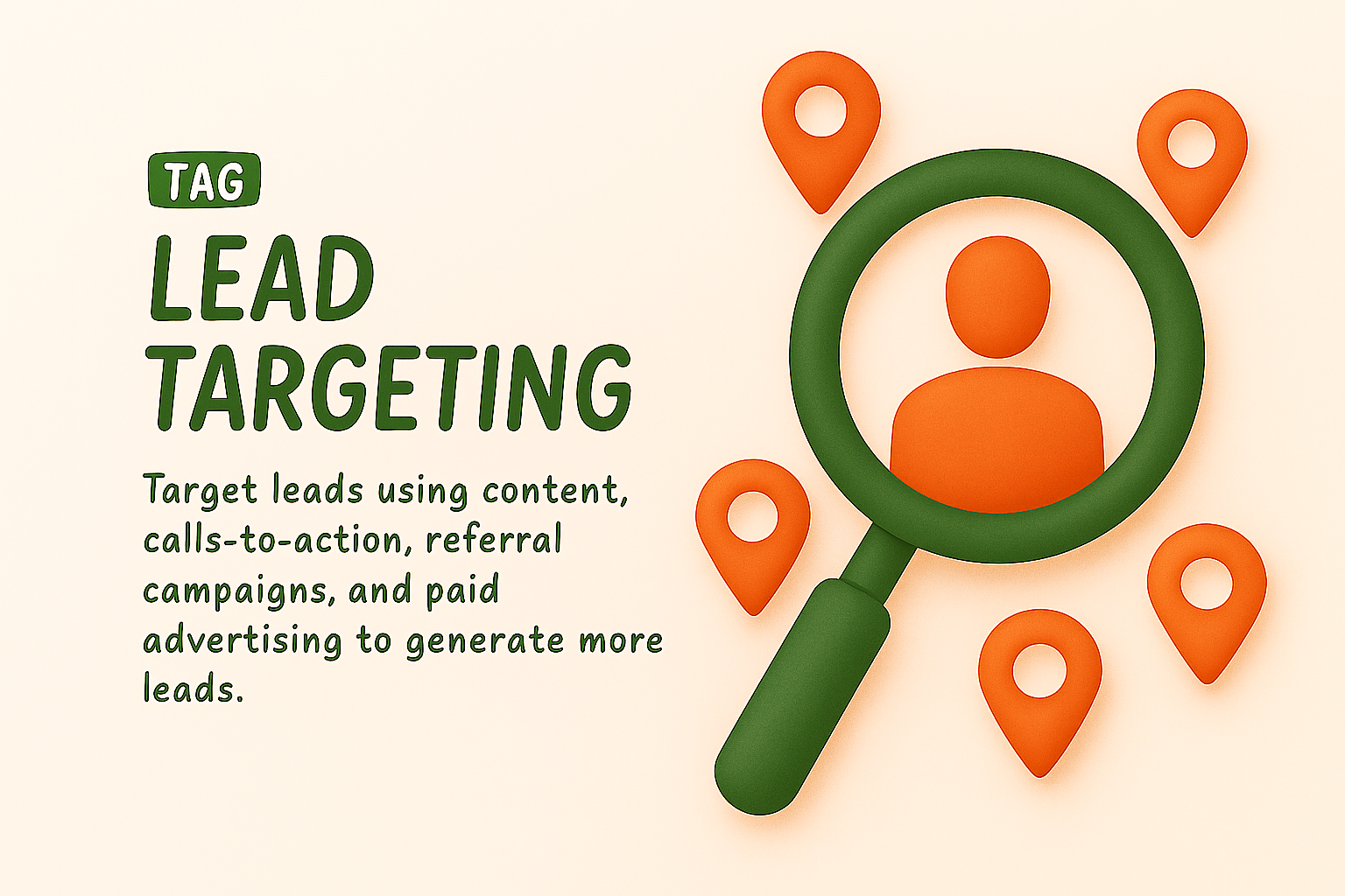 /Collection: /by davooda/Type: PNG/A modern graphic illustrating lead targeting with a magnifying glass and location markers. Ideal for marketing presentations and digital content aimed at generating leads.
