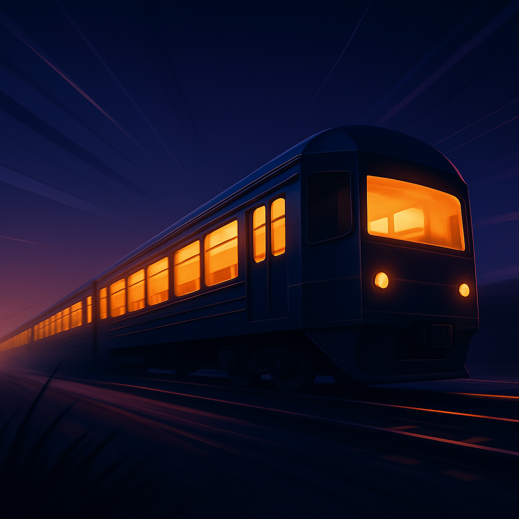 A dynamically illustrated night train emits a warm glow from its windows, cutting through the surrounding darkness. The composition features layered elements, creating depth and movement.