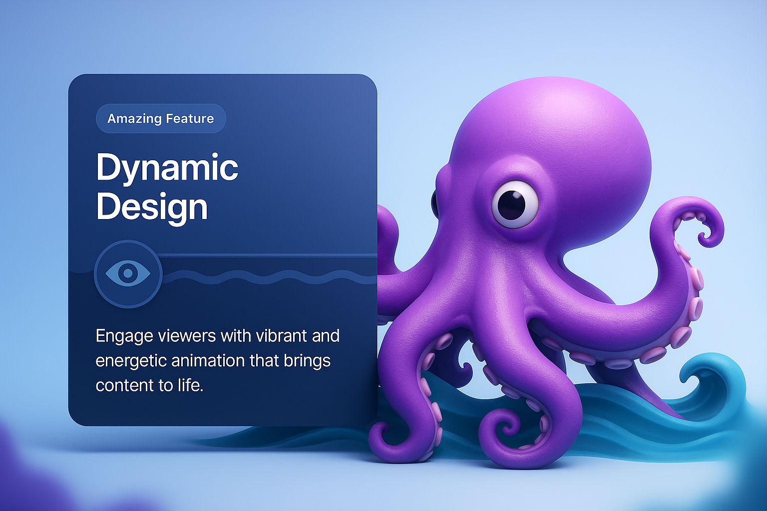 A vibrant 3D octopus is featured against a smooth gradient background. It showcases dynamic design elements with a text block highlighting a feature, emphasizing engaging viewer experiences.