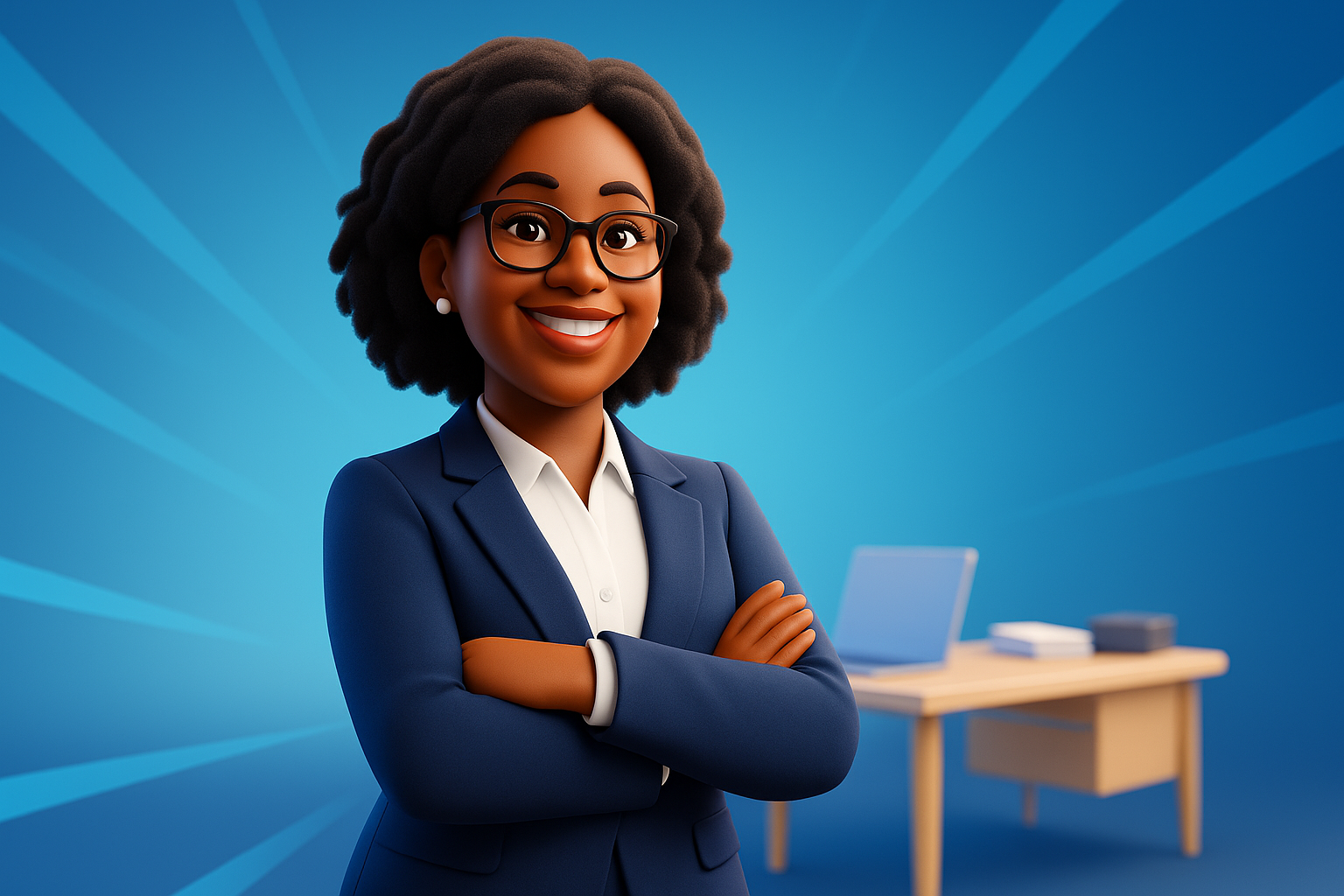 /Collection: /by davooda/Type: PNG/A cheerful middle-aged Afro woman CEO stands confidently in her office, arms crossed, wearing glasses and a navy suit. The vibrant blue background features dynamic rays, enhancing her professional presence.