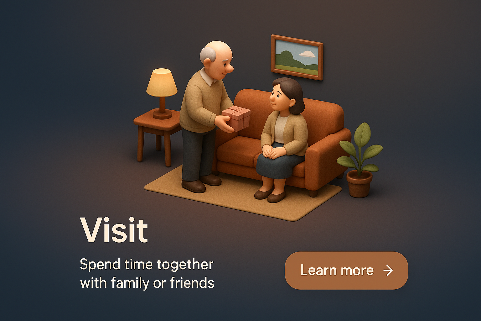 A cozy 3D scene depicting a family visit. An elderly man presents a gift to a woman seated on a sofa, with a warm ambiance and simple decor.