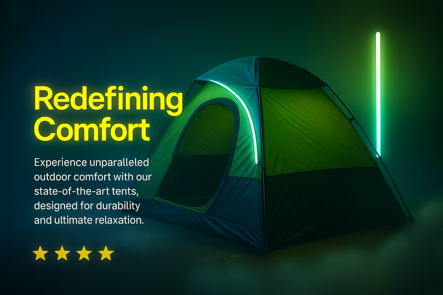 A visually engaging carousel slide showcasing a tent illuminated by neon lights, emphasizing outdoor comfort and relaxation with a bold headline and rating stars.