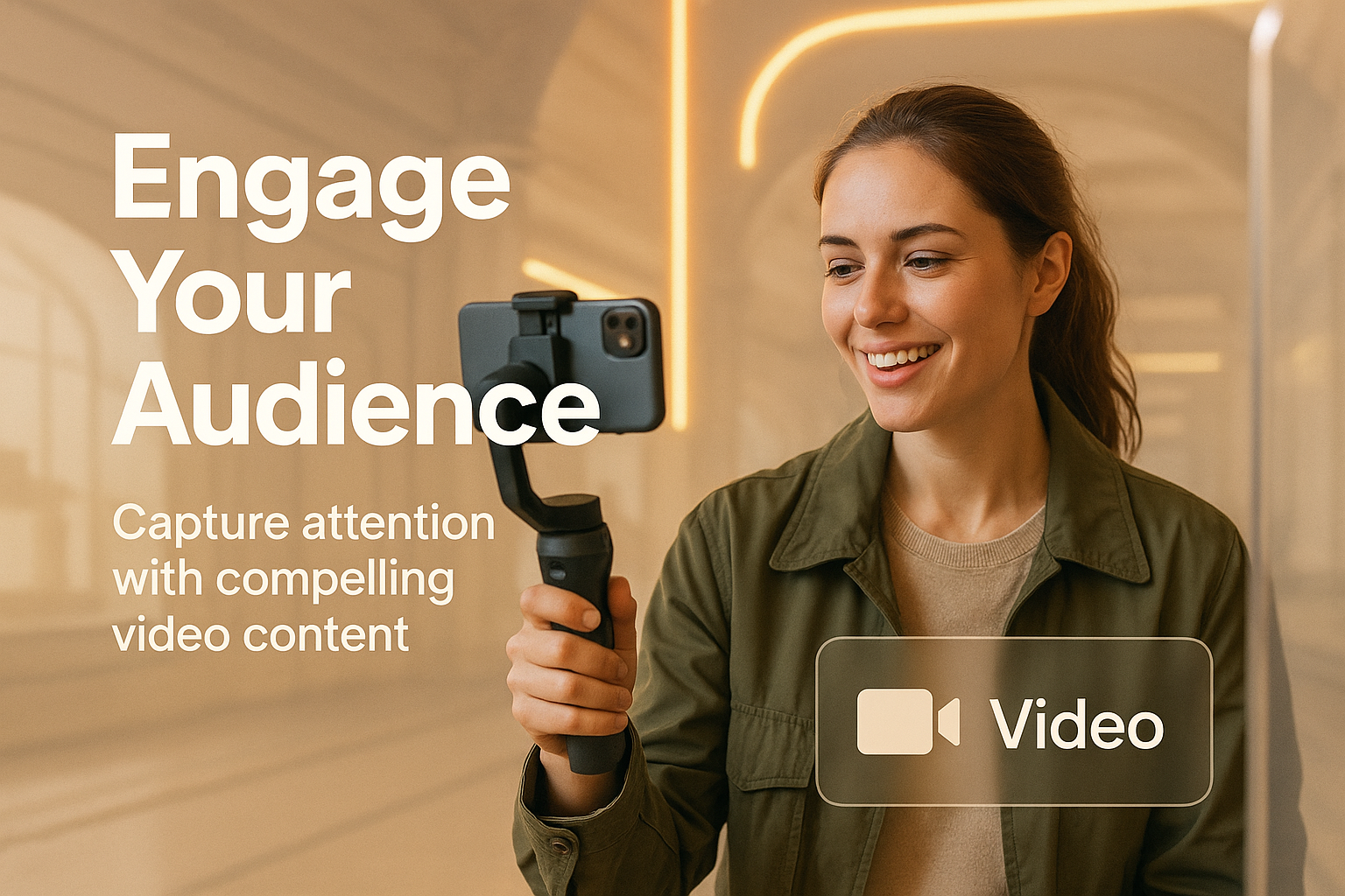 Engaging promotional image showcasing a woman capturing video content with a smartphone stabilizer in a modern environment, ideal for marketing video production services.