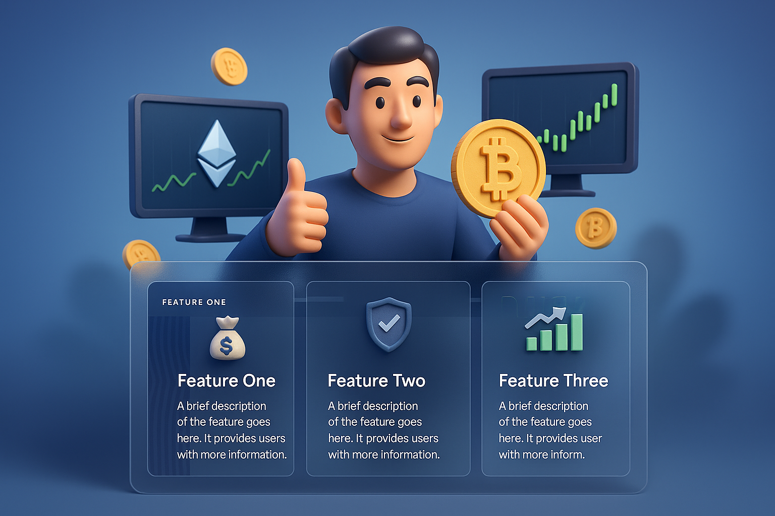 /Collection: /by davooda/Type: PNG/A vibrant 3D illustration featuring a man holding a Bitcoin coin, surrounded by screens displaying cryptocurrency charts. The design includes structured blocks with feature descriptions.