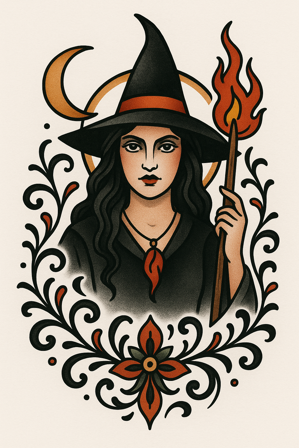 A visually striking illustration of a witch holding a flame, surrounded by intricate floral designs, perfect for Halloween-themed projects or mystical art.