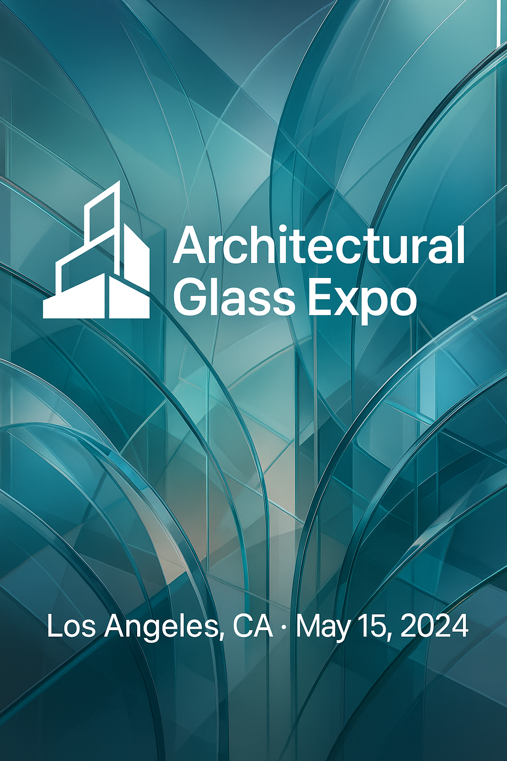 Modern promotional graphic for the Architectural Glass Expo featuring a sleek design with abstract glass-like elements. Ideal for event marketing and branding.