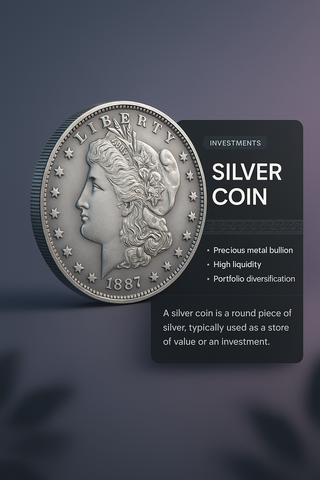 /Collection: /by davooda/Type: PNG/A detailed 3D rendering of a silver coin featuring a vintage design, integrated with a dark information block that highlights investment details and its value as a store of wealth.