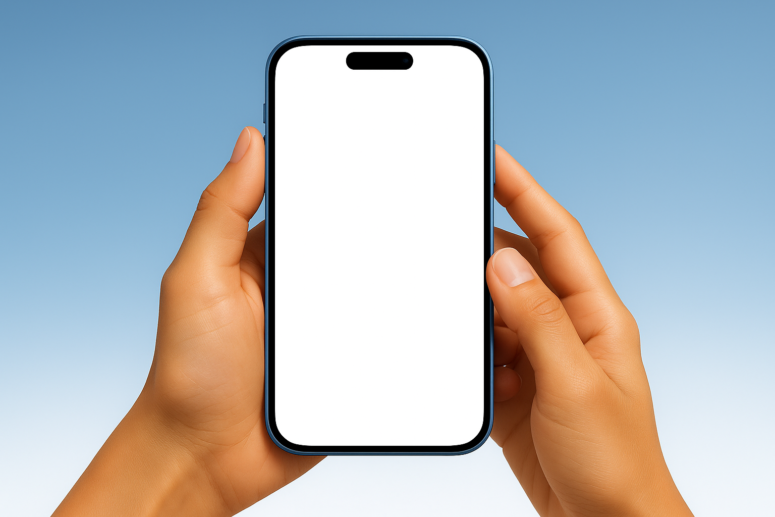 /Collection: /by davooda/Type: PNG/A close-up of a pair of hands holding a blue smartphone with a blank white screen against a gradient blue background. The phone features rounded edges, emphasizing a modern design.