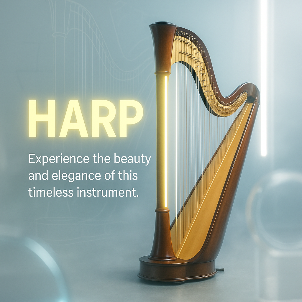 A stunning image of a harp presented in a modern and elegant setting, showcasing its beauty and craftsmanship. Ideal for music-related promotions or artistic displays.