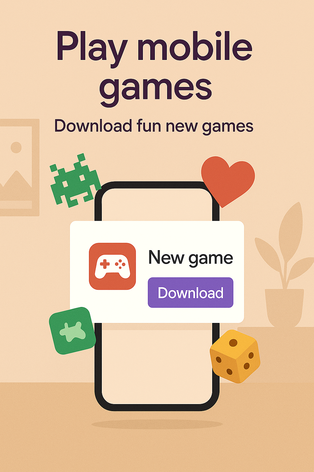Vibrant promotional graphic for mobile games, showcasing a smartphone with playful game elements. Ideal for app marketing and social media campaigns.