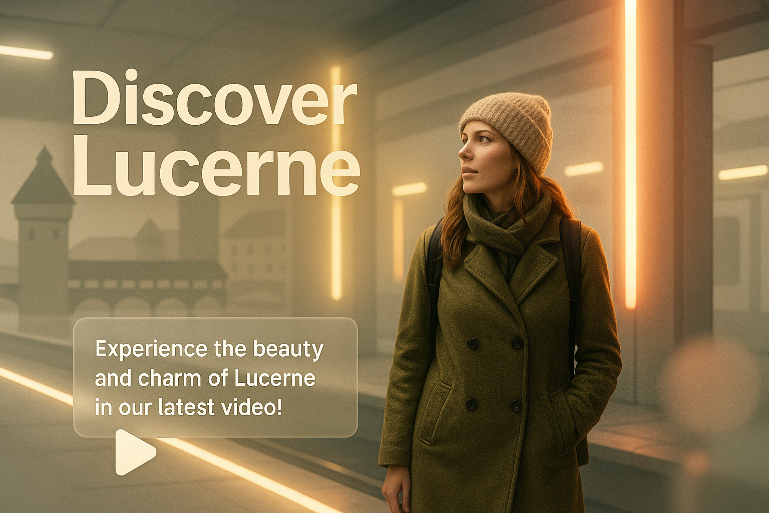 Engaging promotional image for a travel video highlighting Lucerne, featuring a woman in stylish winter attire and a modern, atmospheric background. Ideal for social media or video platforms.