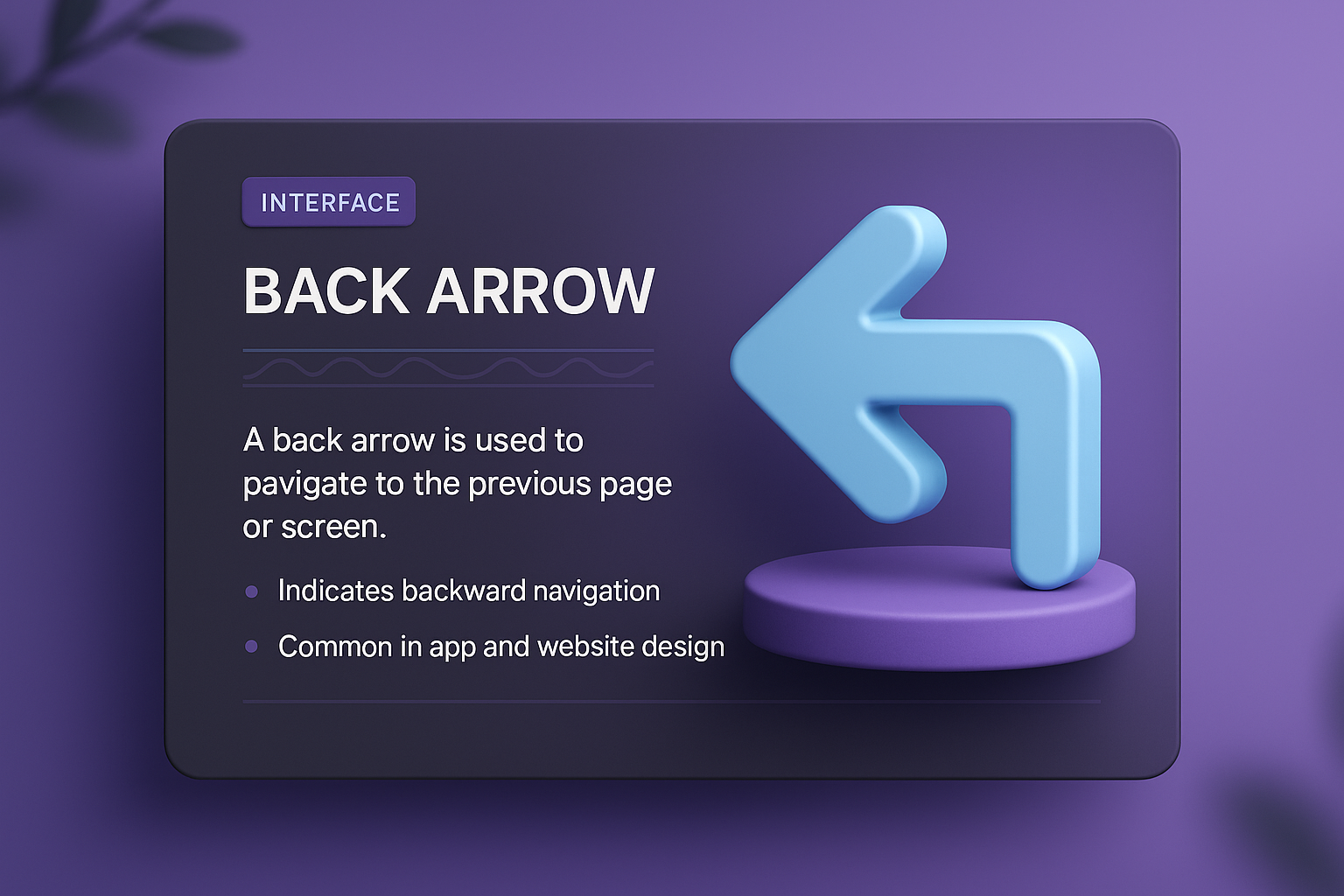 A modern design featuring a 3D back arrow on a gradient background. The layout includes a dark label with descriptive text, highlighting navigation in web design.