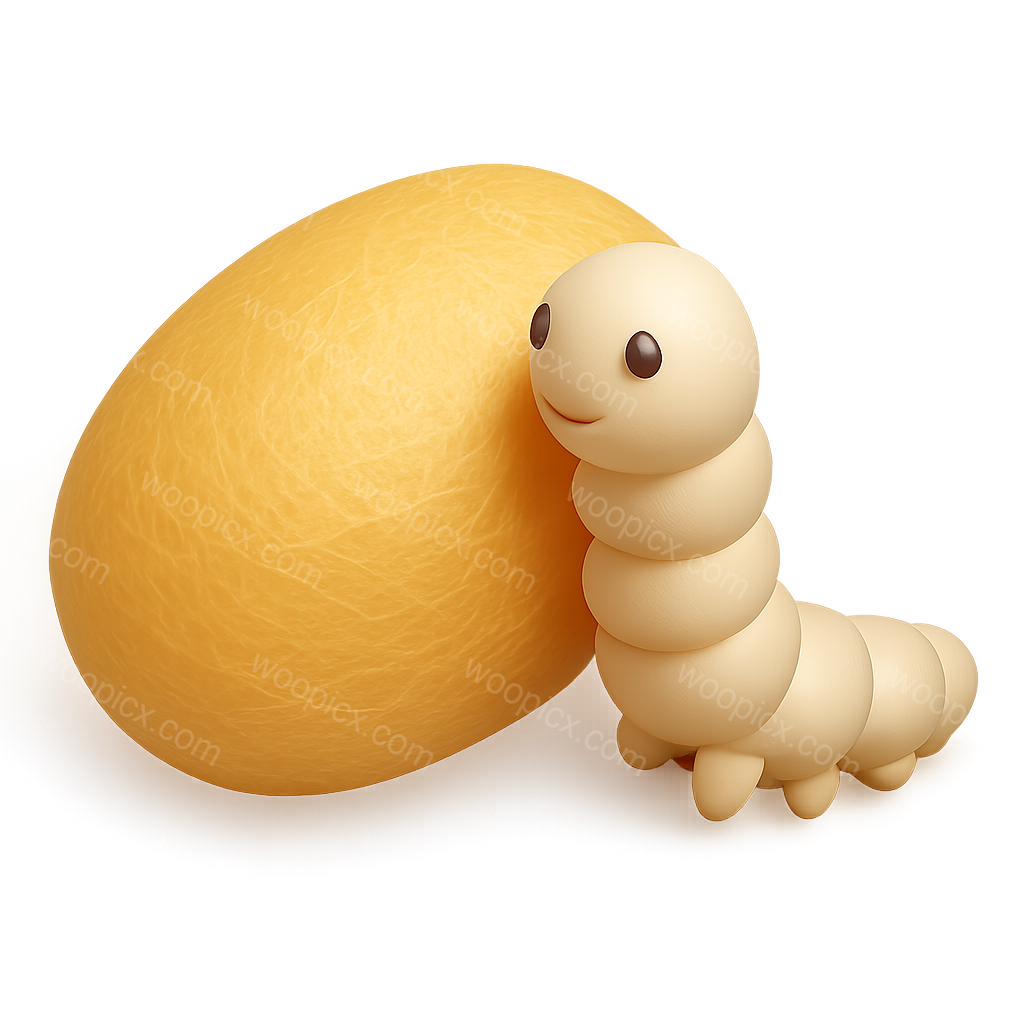 A stylized 3D icon featuring a silkworm next to a yellow cocoon. The image presents a warm color palette with a smooth, volumetric design, enhancing the 3D effect.