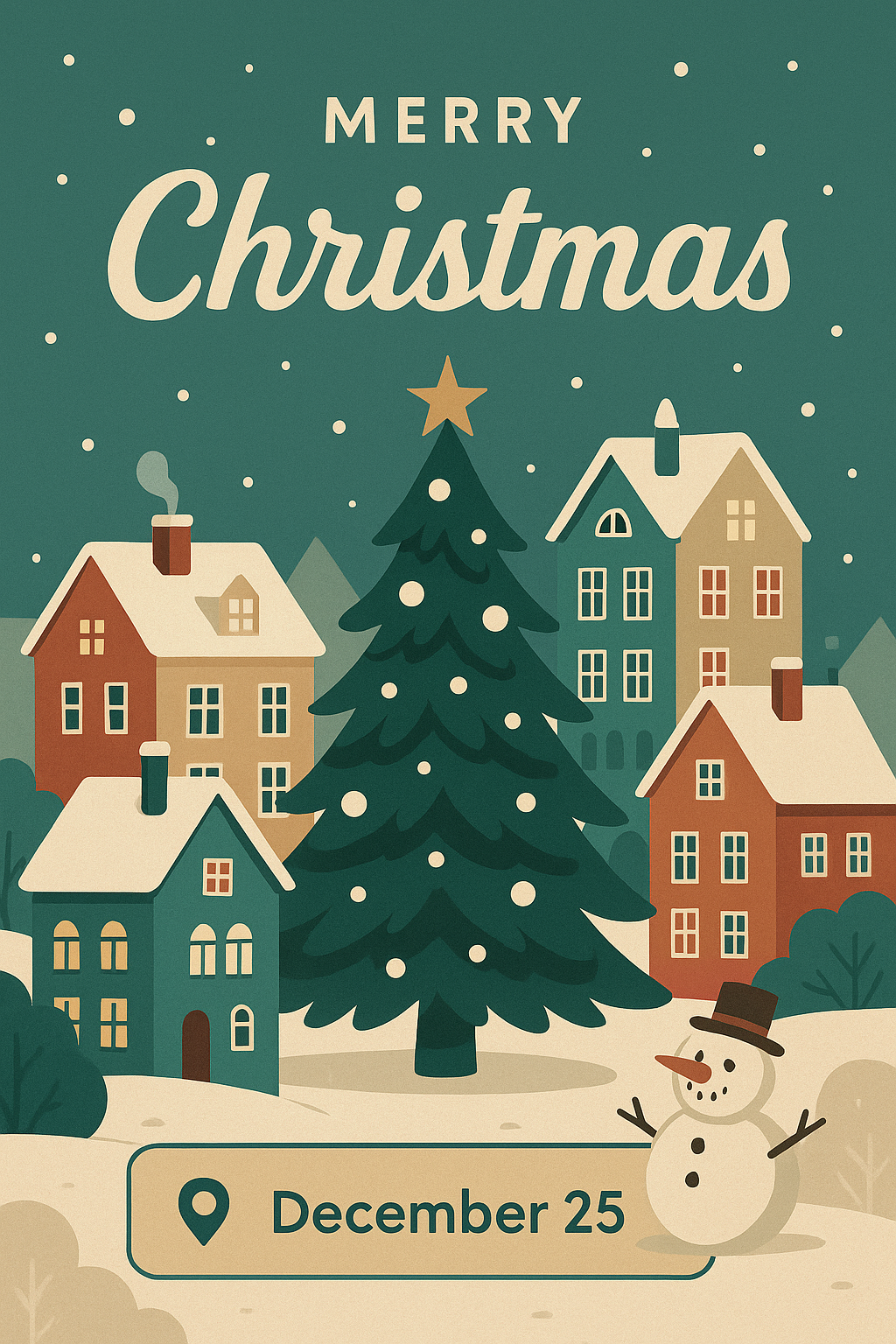 Charming holiday-themed graphic showcasing a snowman, Christmas tree, and cozy houses, perfect for seasonal greetings and festive marketing.