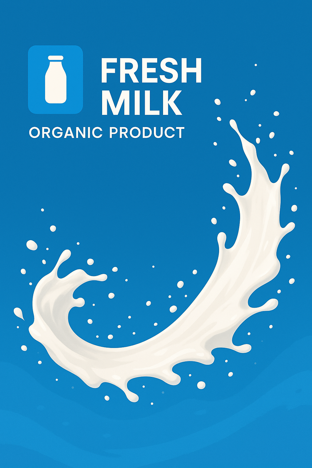 Vibrant promotional graphic featuring a dynamic milk splash on a blue background, ideal for organic product marketing and dairy branding.