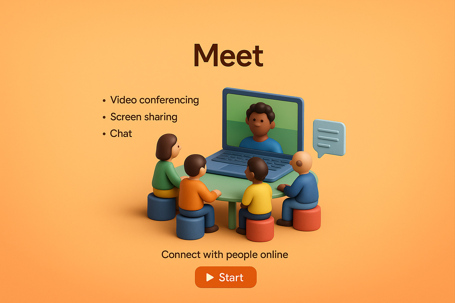 A vibrant 3D illustration depicting a virtual meeting with diverse characters around a laptop. The background features a smooth gradient, enhancing the engaging atmosphere.