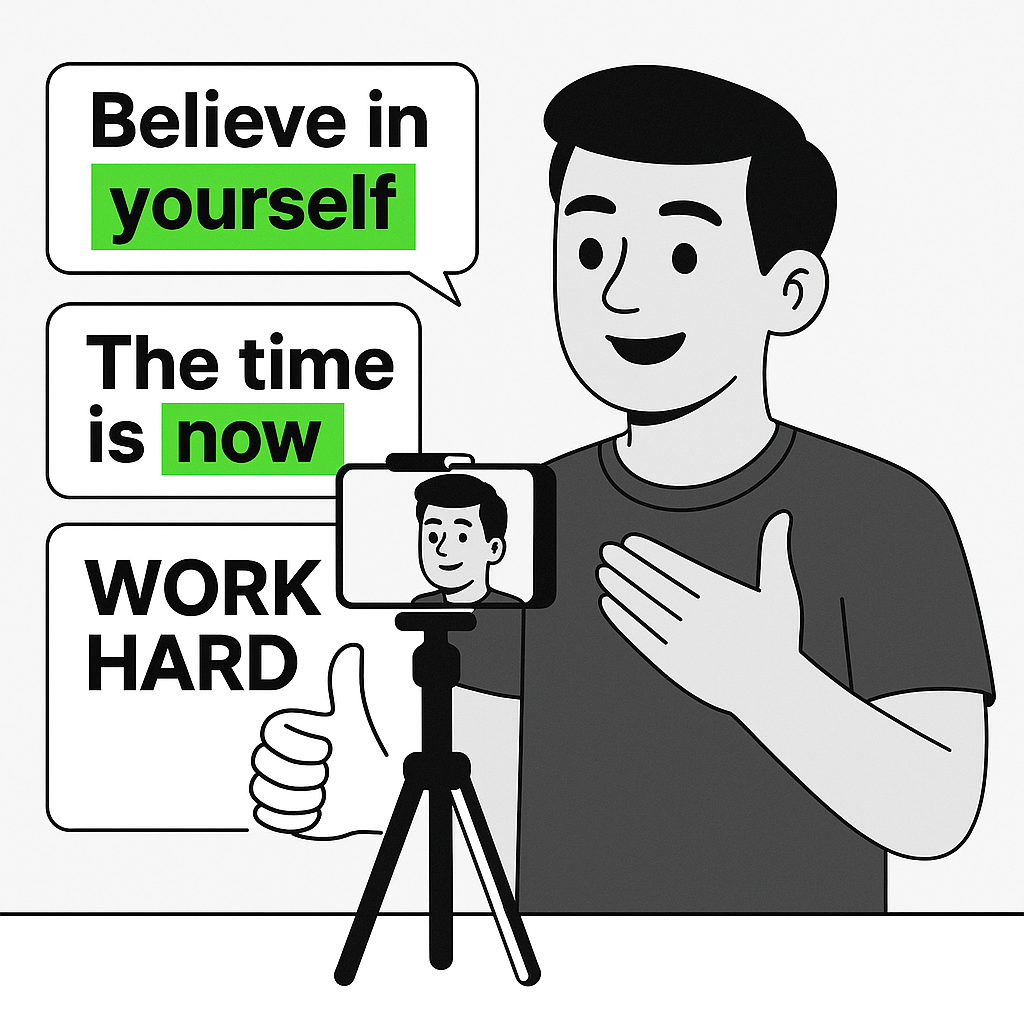 /Collection: /by davooda/Type: PNG/An illustrated graphic depicting a person recording a motivational message with a smartphone on a tripod. The design features bold text overlays emphasizing encouragement and hard work, suitable for social media or inspirational content.