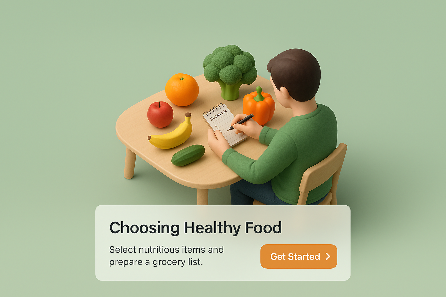 /Collection: /by davooda/Type: PNG/A 3D scene depicting a person at a table selecting healthy food options, including fruits and vegetables, while preparing a grocery list. The design features a soft gradient background.