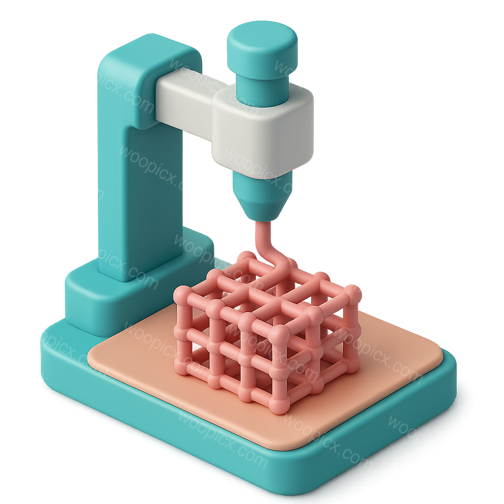 A colorful 3D icon depicting a bioprinting scaffold. The design features a printer head extruding a lattice structure, showcasing a modern and volumetric style.