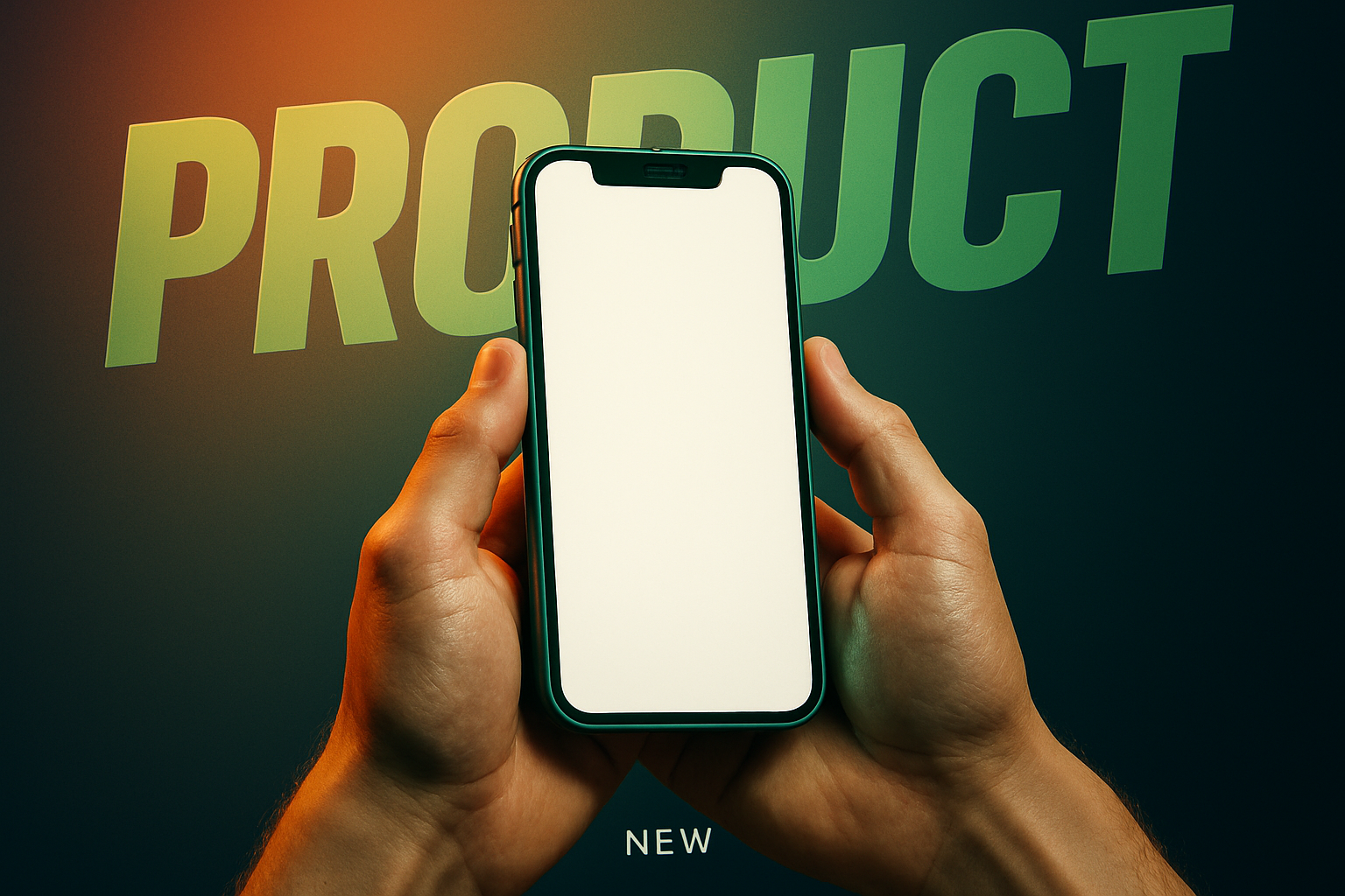 /Collection: /by davooda/Type: PNG/A hyper-realistic image showcasing a green phone held in two hands against a gradient background. The composition features bold typography, emphasizing modernity and energy.