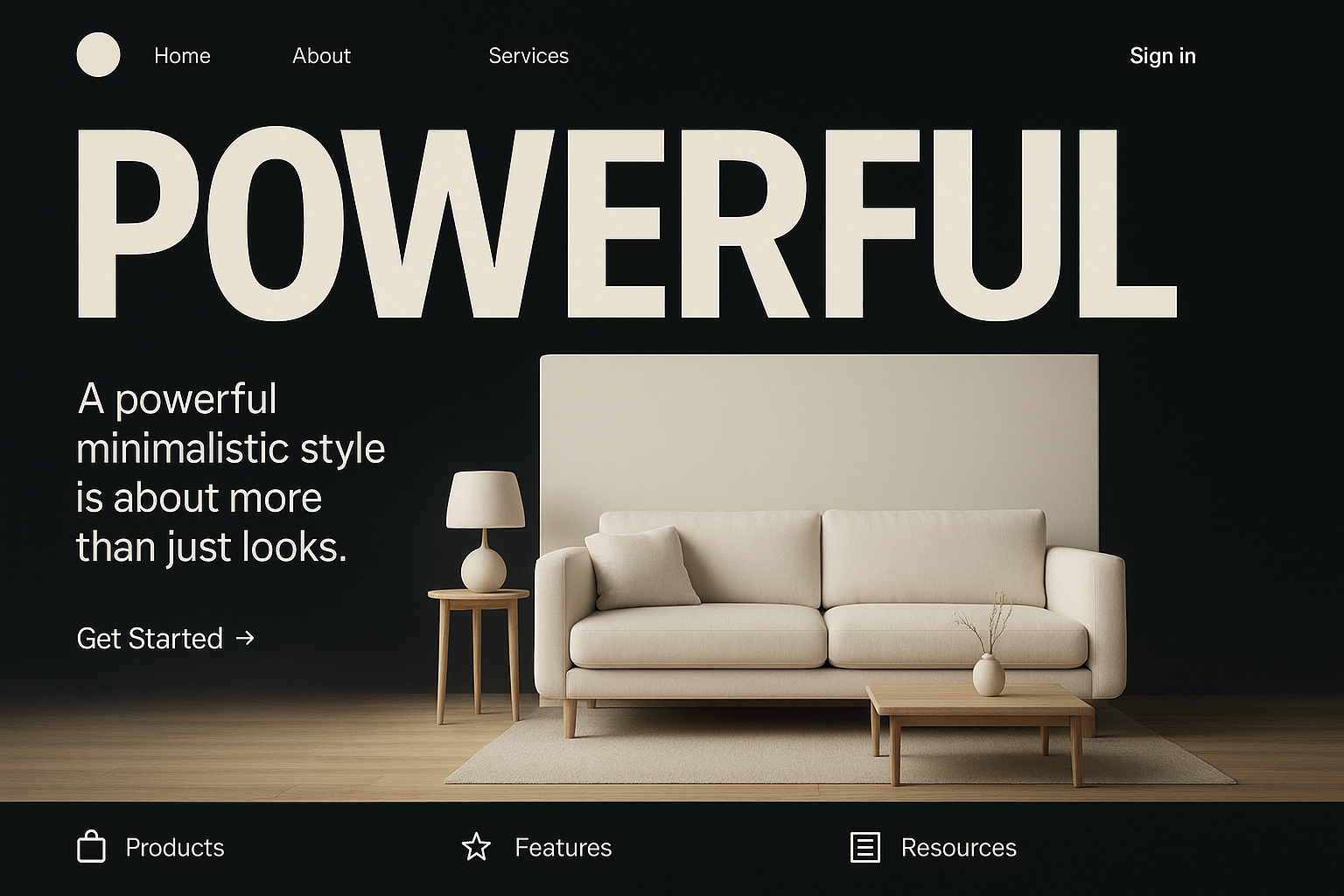 /Collection: /by davooda/Type: PNG/A striking 3D render of a modern minimalist living room featuring a white sofa against a dark gradient background, emphasizing bold typography and balanced layout.